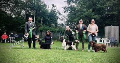 Besonders gefreut hat uns, dass am zweiten "Show"-Tag alle 10 Teams der Gesamtwertung noch im "Rennen" waren, somit wurde es am Ende noch einmal richtig spannend. Insgesamt freuten wir uns über eine beachtliche Meldezahl von 74 Spaniels aus sieben Rassen. Eine Spezialrassehunde-Ausstellung die an "alte" Tage anknüpfen konnte und so ließen alle Spaniels die Herzen höher schlagen. Den Auftakt im Ring machten die English Cocker Spaniels. Diese wurden von unserem ehemaligen Präsidenten Sascha Paduch gerichtet. Ed Casey und Sascha Paduch wechselten sich im Ring ab und haben alle Spaniels am Stück gerichtet. Unser "Gourmet-Team" versorgte alle mit allerlei Köstlichkeiten vom Grill und leckeren Waffeln. Nach einer kleinen Sektpause starteten dann die "Endkonkurrenzen". Nach dem alle "Best of Breeds" feststanden, ging es mit dem Highlight und den "Best in Show"-Wettbewerben weiter. Am Ende konnte der English Cocker Spaniel "John Lennon vom Moorsbachtal" das "Best in Show" gewinnen. Dicht gefolgt vom English Springer Spaniel "Felicitous Luke" und der drittplatzierten Field Spanielhündin "Rodkaapje of the Field Society". Es folgte eine weitere, letzte Ehrung zum Gesamtsieger und damit "Work&Show-Winner". Dieser Titel ging an den noch sehr jungen Irish Water Spaniel "Bumblebee the Waterspaniel".