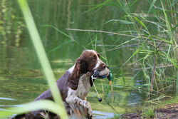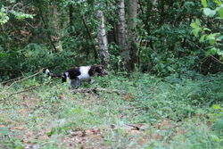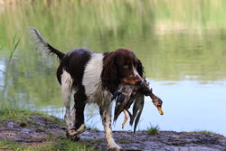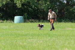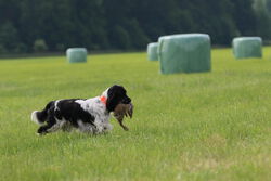 Die Kaninchenschleppen der Spaniels in Vorbereitung auf die HZP wurden bereits sehr gut gearbeitet und die Wasserarbeit wurde je nach Ausbildungsstand von den jungen Spaniels freudig angenommen. Das Fach "Stöbern" wurde von allen Spaniels gearbeitet und die "Freiverlorensuche" mit Bringen von Federwild wurde auch geübt.