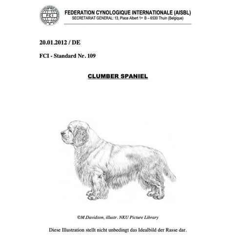 Allgemeines Erscheinungsbild: Gut ausgewogen, guter Knochenbau, lebhaft, mit einem nachdenklichen Ausdruck. Seine gesamte Erscheinung drückt Kraft aus. Der Clumber soll fest, gesund und fähig sein einen ganzen Tag auf dem Feld zu arbeiten.